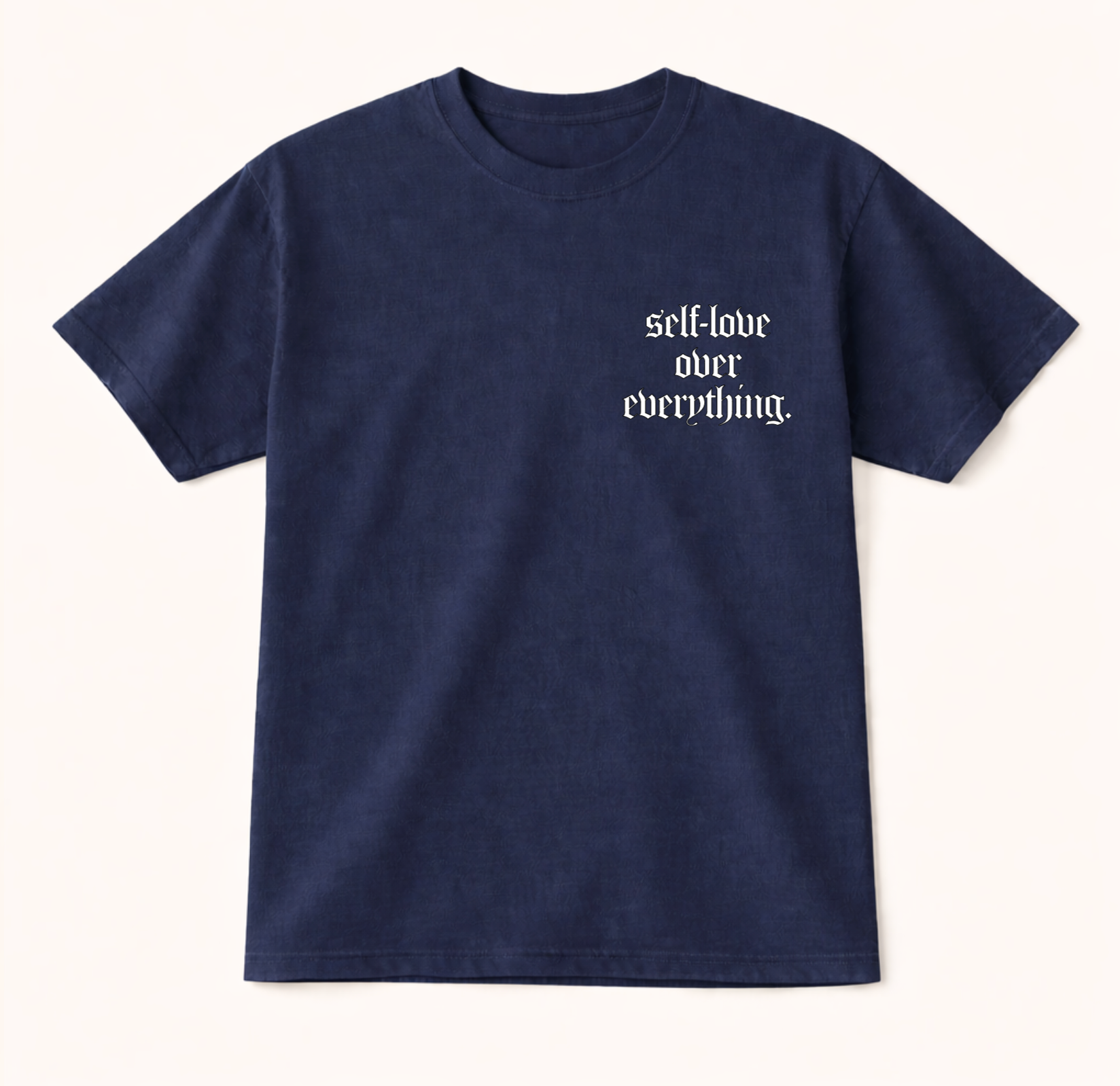 This made-to-order t-shirt features “self-love over everything.” placed on the front.